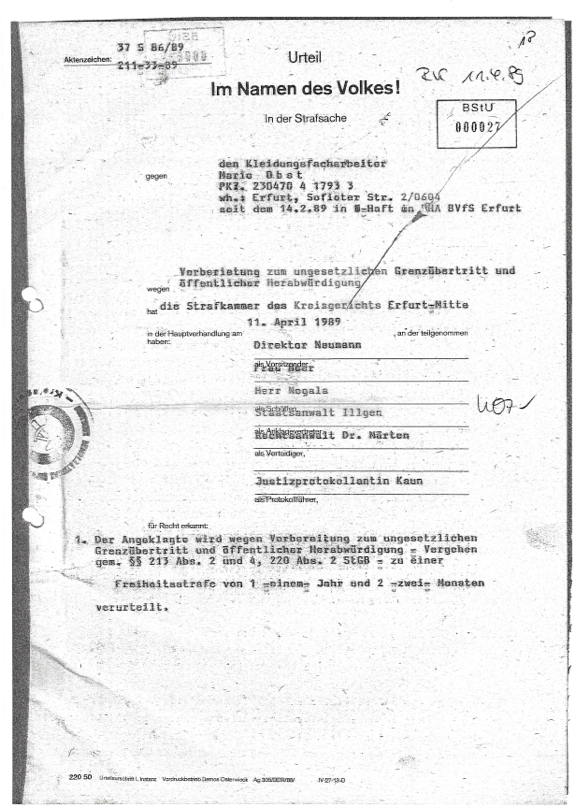 Laut den Unterlagen des Bezirksgerichts Erfurt wurde Obst aufgrund der „Vorbereitung zum ungenehmigten Grenzübertritt“ sowie der „öffentlichen Herabwürdigung“ der DDR verurteilt. Diese Anschuldigungen waren typisch für die Strafverfolgung von Dissidenten und Fluchtwilligen in der DDR, die oft mit langen Haftstrafen für den bloßen Versuch der Ausreise bestraft wurden. Das Gericht, das am 11. April 1989 tagte, verurteilte Obst zu einer Freiheitsstrafe von einem Jahr und zwei Monaten.