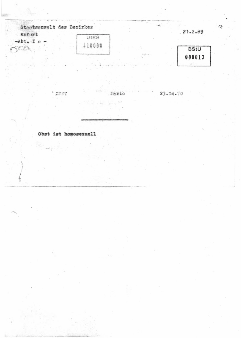 Die Staatssicherheit der DDR war bekannt dafür, alles akribisch zu dokumentieren und aufzubewahren – ganz gleich, wie persönlich oder banal die Information war. So findet sich in meiner Stasi-Akte ein Vermerk vom 21. Februar 1989, verfasst vom damaligen Staatsanwalt des Bezirks Erfurt: „Obst ist homosexuell.“